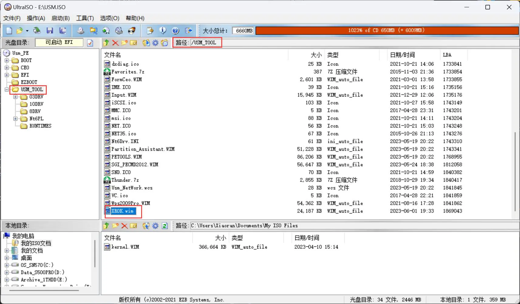 如果你已经制作好ISO镜像,那么将位于ISO文件的以下路径:/USM_TOOL/XROK.wim,后续可以使用 UltraISO 等工具把最新版 XROK.wim 替换进去。